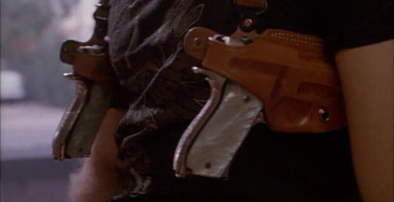 There is nothing immoral about the pair of Smith & Wesson 39s carried by Sheen’s character in the film. These 9mm semi-auto pistols come stainless with pearl handles. He carries them in a Galco dual-pistol shoulder rig that looks almost as good as the guns.