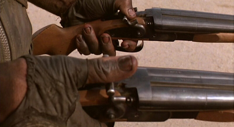 The motorcycle movie guns featured are a pair of altered Rossi Overland double-barrel shotguns carried by Randle “Tex” Cobb, who plays biker bounty hunter Leonard Smalls. The Lone Biker of the Apocalypse doesn’t say much in the film, but his looks, demeanor and arms show the menacing nature and point of his character.