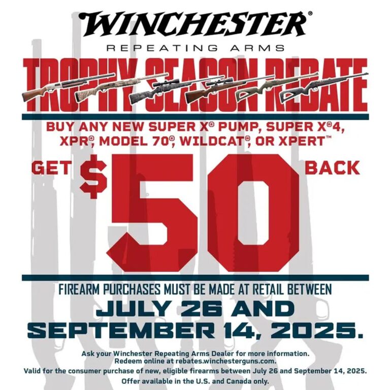 Winchester Trophy Season Rebate 2025 Purchase between July 26, 2025 – September 14, 2025 Submission DEADLINE September 29, 2025 Rebate Form See Rebate Terms Shop Eligible Winchester Firearms Winchester Repeating